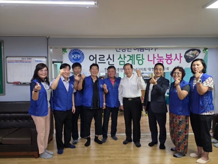 울산남구지부는 7월 17일 정오, 울산 대현동 동부아파트 경로당에서 어르신 30여 명을 초청해 삼계탕 나눔 봉사활동을 진행했다. 이번 행사는 자유총연맹 울산남구지부 주관으로 열렸으며, 대현지부 회장 이홍기 씨와 회원들이 함께 참여해 정성을 보탰다.